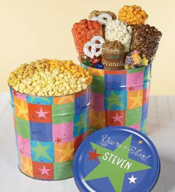 Buying The stars in your life deserve something extra yummy: a 3 1/2 gallon 3-Way tin filled with all-natural Butter, Cheese and secret-recipe Caramel corn. Or send along a Deluxe Snack with chocolate chip cookies, Jelly Belly? beans, peanuts, premium popcorn (Cheese, White Cheddar, Cinnamon and Chocolate), 2 rainbow pretzels, super sour stars and chocolate stars. Personalize up to 9 characters for even more fun! sale