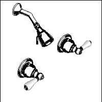 Hampton 2-Handle Shower Faucet with Porcelain Lever Handles available in different finishes for better look and feel.,ADA approved Porcelain cross Handles 0.5" NPT Female threaded inlets Male outlets Brass adjustable showerhead 1 4 Turn washerless ceramic disc valve cartridges Ceramic Disc Valving assures drip-free for life performance Durable Brass Construction I.P.S diverter spout Adjustable Brass Showerhead,ADA Compliant: Yes Finish: Polished Brass, Polished Chrome, Satin Flow Rate (GPM): 2.50 Flow Rate GPM (Showerhead): 2.50 Function: Multi Function Handle Style: Lever Hand